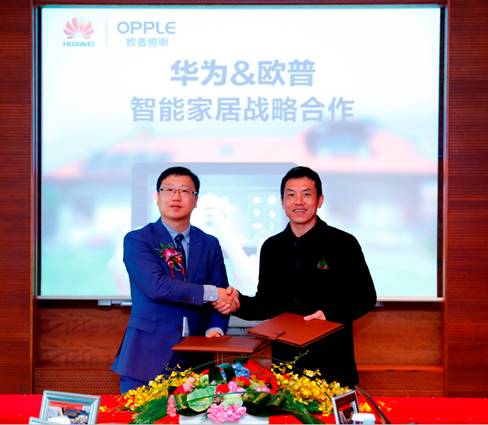 (图注:欧普照明董事长王耀海(右)和华为消费者事务首席战略官邵洋(左)在签约仪式上)