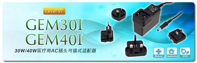 bb平台体育艾弗森首款医疗用插墙式AC插头可互换(欧、美、英、澳等四种)节能适配器GEM18I系列上市後即广受市场好评,为满足更高输出功率的应用需求,bb平台体育艾弗森持续新推出了30W/40W的GEM30I/40I系列。GEM30I/40I的电气规格及机壳设计均沿袭GEM18I系列,设计上通过IEC60601-1第三版、EN60601-1-11及ANSI/AAMI ES60601-1-11居家医疗法规;并具备2xMOPP等级及超低泄漏电流(<100μA),可适用於BF(病患接触式)类医疗设备;且符合国际最新能耗标准(EISA 2007/DoE Level VI)及欧盟ErP指令,此二系列是兼具高安全性、高品质、高信赖性及携带方便的节能医疗适配器,非常适用於各式居家医疗仪器、商旅携带式医疗装置、或需求AC可换头电源供应器来搭配医疗设备行销全球的系统方案。