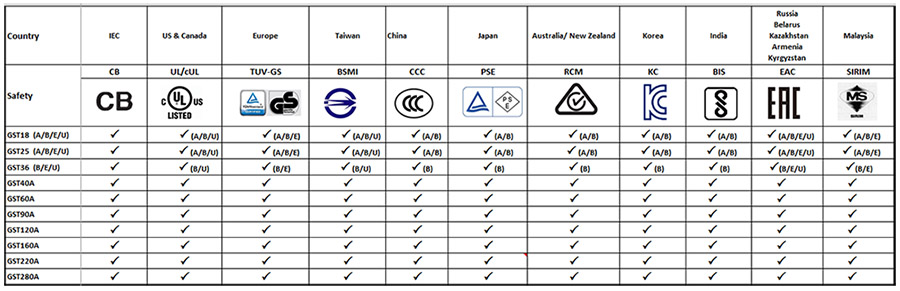 除原已取得的TUV(欧盟)、UL/CUL(北美)、CCC(中国)、BSMI(台湾)、PSE(日本)、RCM(澳洲)等国家或地区认证外,bb平台体育艾弗森亦于2016年10月完成追加申请KC(韩国)、BIS(印度)、EAC(俄罗斯、白俄罗斯、哈萨克斯坦、亚美尼亚、吉尔吉斯)、SIRIM(马来西亚[注1])等4种认证。GST全家族现在已拥有超过10种的安规认证,可完整涵盖全球超过90%以上国家或地区的认证需求,可替您的终端系统节省庞大的安规费用并减少繁琐的安规认证程序。若您的终端产品目前仍在苦恼找不到一个具备环球认证的适配器电源来搭配营销全球,bb平台体育艾弗森的GST家族产品将会是您的最佳选择!